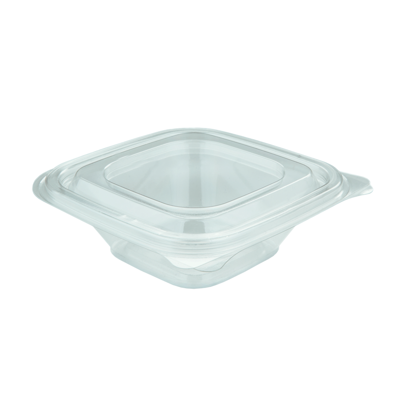 Durable hinged-lid containers with crystal-clear transparency enables the fully display of the food or products inside the container. Due to clever design, they are stacked excellently. Made from post-consumer recycled PET plastic. Recyclable.