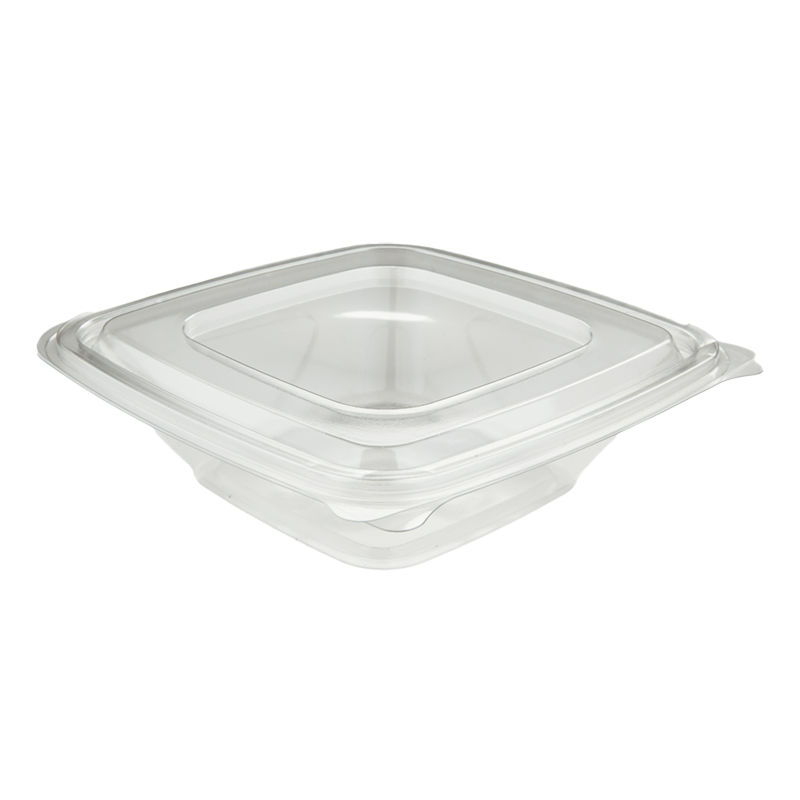 Durable hinged-lid containers with crystal-clear transparency enables the fully display of the food or products inside the container. Due to clever design, they are stacked excellently. Made from post-consumer recycled PET plastic. Recyclable.